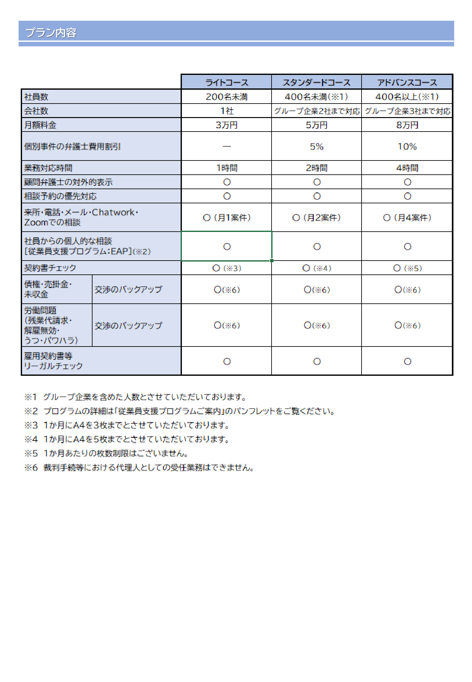 通常の顧問プランよりも若干低額の料金でご利用できます。