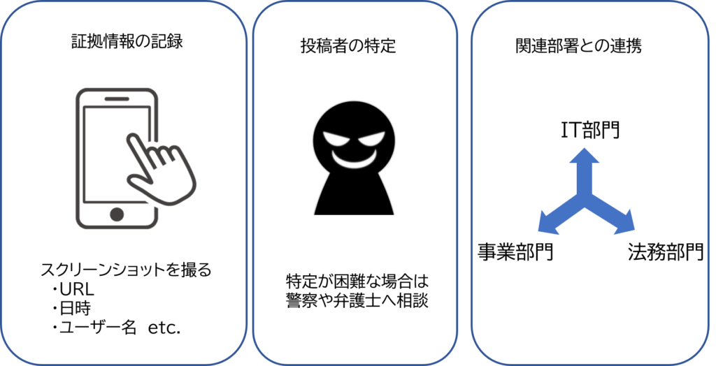 投稿が事業部門や法務部門、IT部門など、他の部署に影響を及ぼす内容である場合は、すぐに連携を取ります。