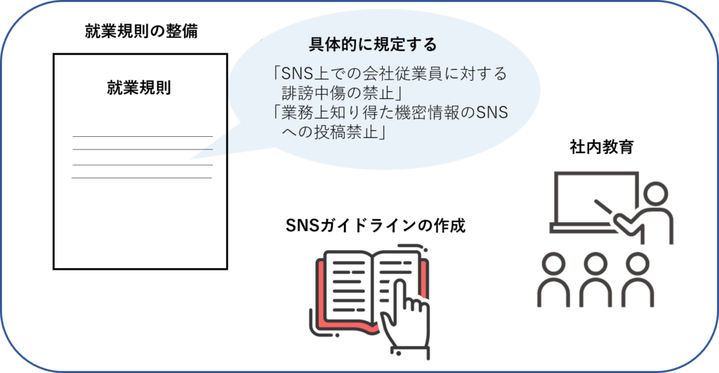 就業規則にSNS利用に関する規定を明確に盛り込み、入社時や定期的な研修で周知徹底を図ります。