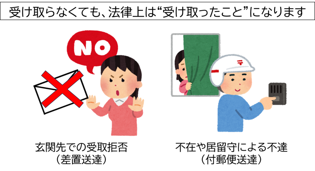 つまり、この手続きが取られてしまえば、その後、書類を実際に受け取り拒否したり、郵便局での保管期間内に取りに行かず返送されたりしたとしても、法的には通常どおり書類を受け取った場合と同じ効力を持つことになります。