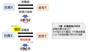 一方、第二審の札幌高等裁判所は1月22日のYによる退職届受理の連絡で合意退職は有効に成立したものの、Xによる2月27日のXによる退職願の撤回と3月27日のYによる懲戒解雇合意退職の効力が両者の合意で撤回されたとした点です。